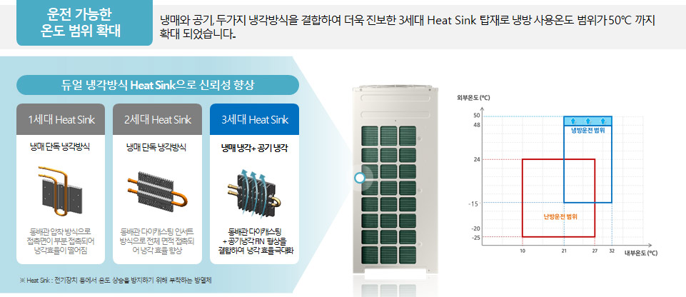 듀얼냉각 방식의 3세대 Heat Sink 탑재로 운전가능한 온도 범위가 확장되었습니다.