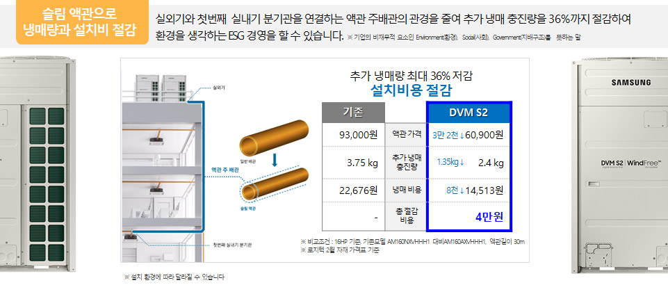 슬림해진 액관으로 추가 충진 냉매량과 설치비용을 절감합니다.
